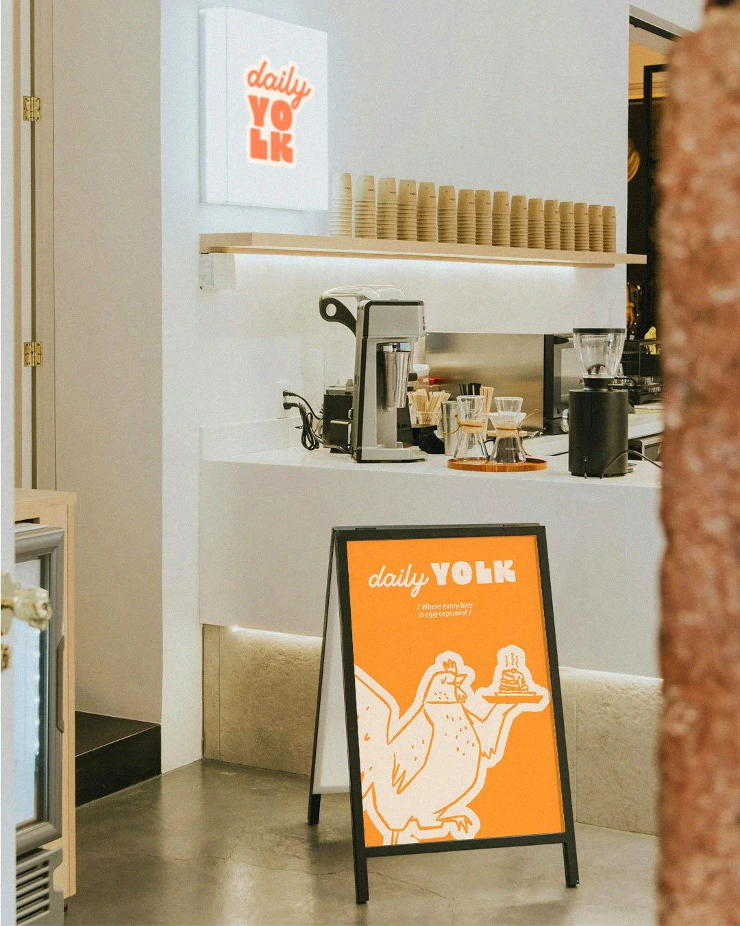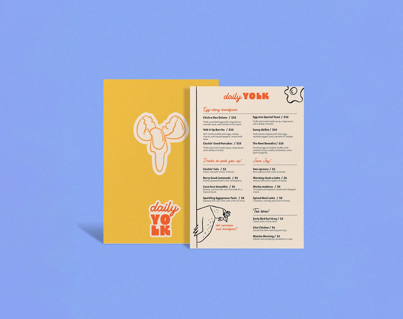 Daily Yolk es un concepto de cafetería moderna que busca llenar las mañanas de energía y buen rollo. El diseño de marca se desarrolló para reflejar una personalidad juguetona y cercana a través de colores vivos, tipografía expresiva y personajes originales.